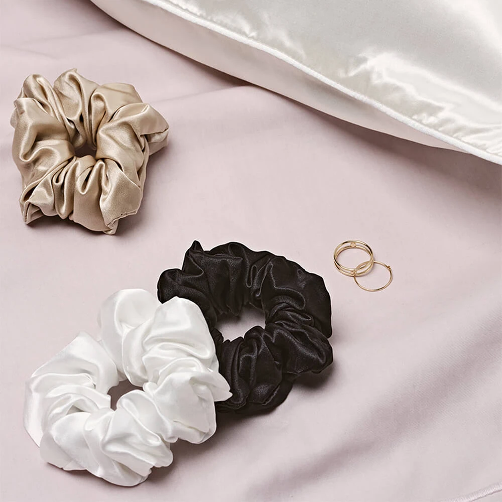Trois chouchous en pure soie de mûrier au maintien ferme, pour habiller ses coiffures sans casser ni marquer ses cheveux.
