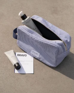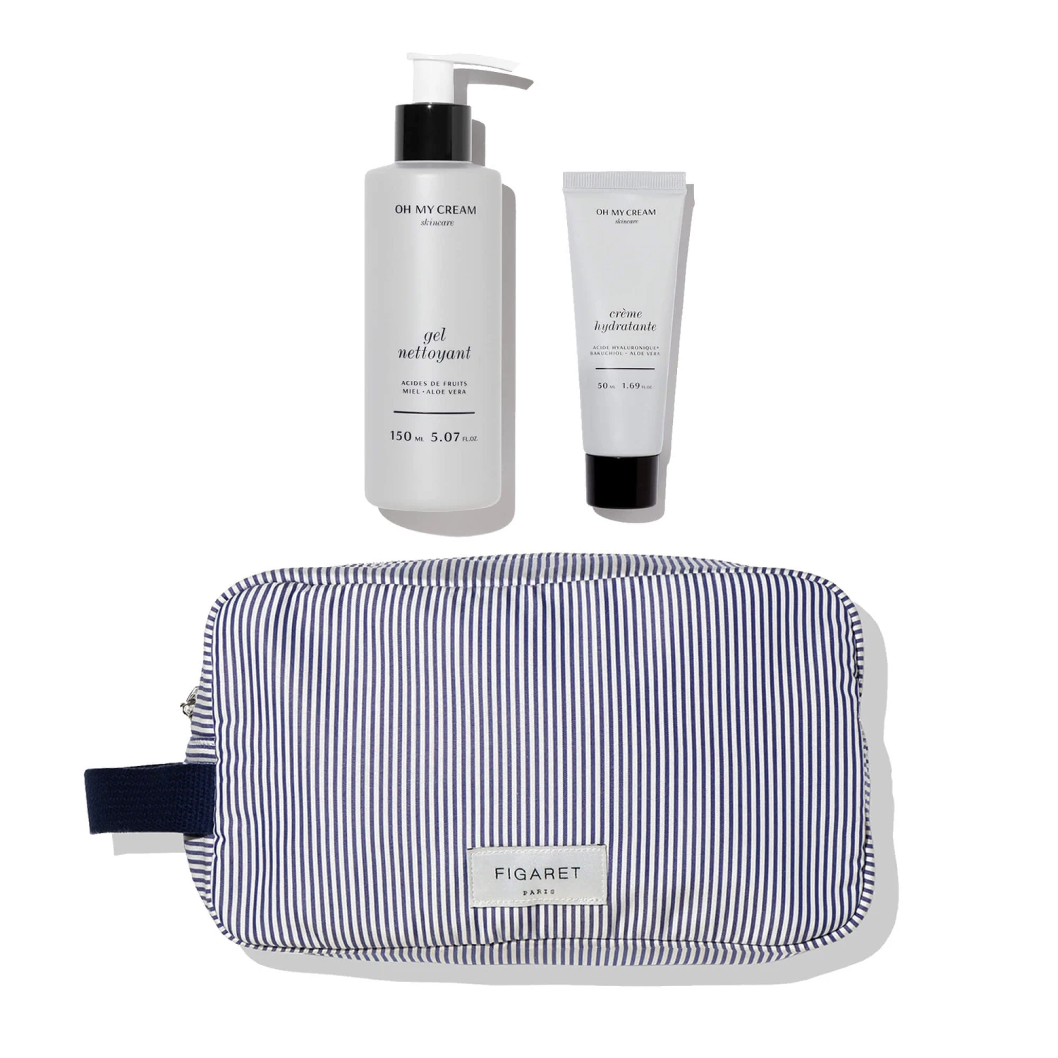 La trousse créée spécialement pour la Fête des Pères en collaboration avec la marque culte de chemises Figaret. Réalisée à partir de chutes de chemise en popeline rayée bleu et blanc, elle contient le duo d’essentiels pour les hommes (mais pas que !) avec le Gel Nettoyant et la Crème Hydratante Oh My Cream Skincare.